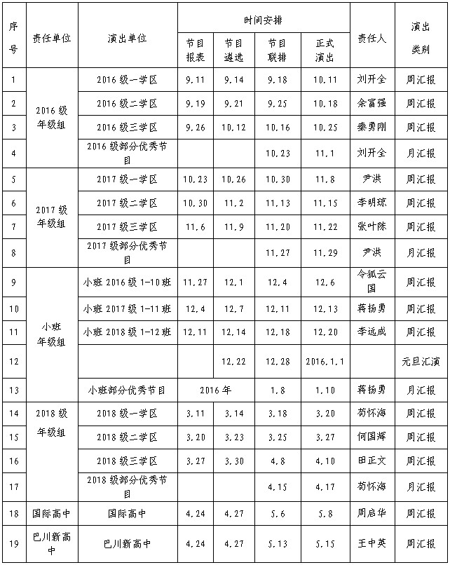 (1)相關(guān)班級各推薦節(jié)目3-6個(gè),提倡節(jié)目形式多樣化,節(jié)目種類3種以上,并根據(jù)時(shí)間安排表(見后),向年級組報(bào)送節(jié)目信息表,包含:演出單位、節(jié)目名稱、節(jié)目形式、節(jié)目演出時(shí)間、演員人數(shù)等信息,年級組收齊后報(bào)藝體處。