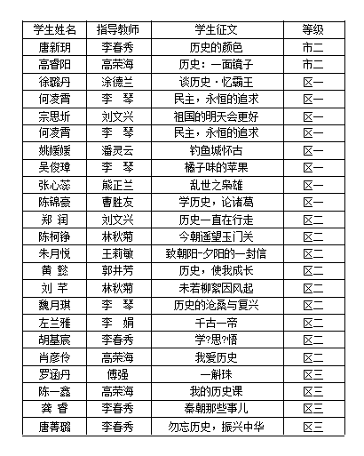 巴川中學訊(教科處 章磊)根據《關于舉行重慶市中學生首屆歷史學?思?悟征文比賽的通知》和《關于舉行銅梁區中學生首屆歷史學?思?悟征文比賽的通知》精神,為進一步推動我校中學歷史教學適應歷史課程改革和歷史教學發展的新趨勢,凸顯學生的學習主體地位,我校積極組織學生參加比賽。經專家評選,我校初中部學生征文2篇獲市二等獎,8篇獲區一等獎,9篇二等獎,三等獎4篇。