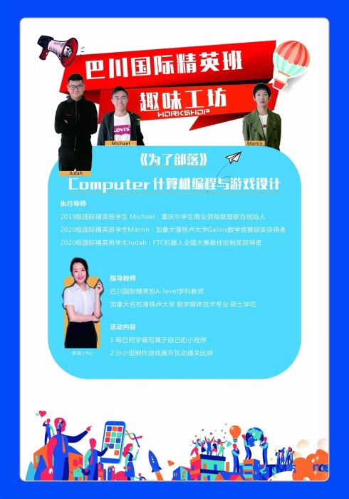 周日下午,一場(chǎng)由巴川量子中學(xué)國(guó)際精英班傾力策劃的趣味工坊活動(dòng)圓滿舉行。“workshop(工坊)”是早期出現(xiàn)在教育心理學(xué)領(lǐng)域的一個(gè)概念,國(guó)際精英班采用這一創(chuàng)新型教輔模式,設(shè)計(jì)了以戲劇,物理,計(jì)算機(jī)和商業(yè)為主題的四門(mén)課程,將跨學(xué)齡的孩子們聚集在一起,在來(lái)自不同年級(jí)的小導(dǎo)師帶領(lǐng)下,給孩子們平臺(tái)和空間,共同思考,探討問(wèn)題的解決方案。