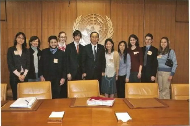 ▲ ?Amy(左一)與時(shí)任聯(lián)合國秘書長潘基文合影