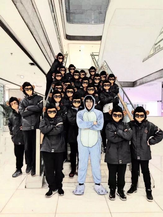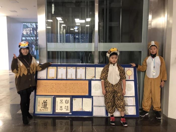 ▲ ?潘云芬校長和全體干部“萌萌”地融入其中