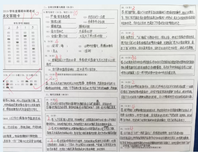 其實,這部分秘笈就是學校教務處前不久組織的2019年春期半期考試優秀答題卷展評評選出來的規范答題卡。在經過了班級、年級初評和學科組長們的復評之后,最終選出了這些答題卡在博雅樓大廳進行展示。下學期開學,學校還會在開學典禮上對這些規范答題卡的主人們進行全校表彰。