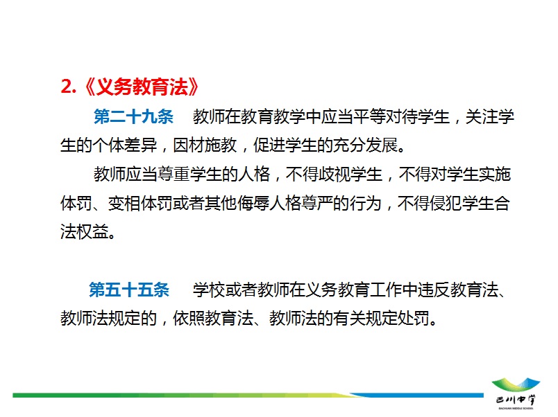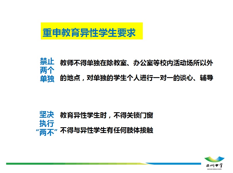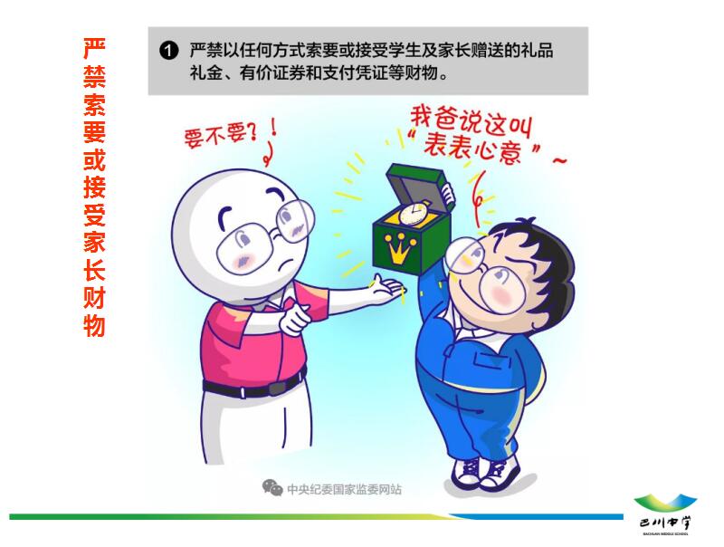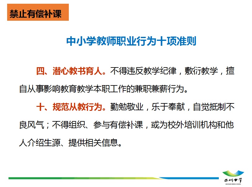 ????????為了幫助老師們深入了解師德規定,內化于心,外化于行,學校黨委用心對相關法律、國家和地方政策中有關師德規定的內容進行了逐一梳理、細化,并制成精美的PPT。依次組織全體教職工認真學習了《中華人民共和國憲法》、《中華人民共和國未成年人保護法》、《中華人民共和國義務教育法》和《教師法》中有關師德規定的詳細內容和要求,以及《中小學教師職業道德行為十項準則》、《中小學教師違反職業道德行為處理辦法》、《教育部為教師劃定“六條紅線”》、《重慶市中小學教師職業道德“十不準”》等文件精神。