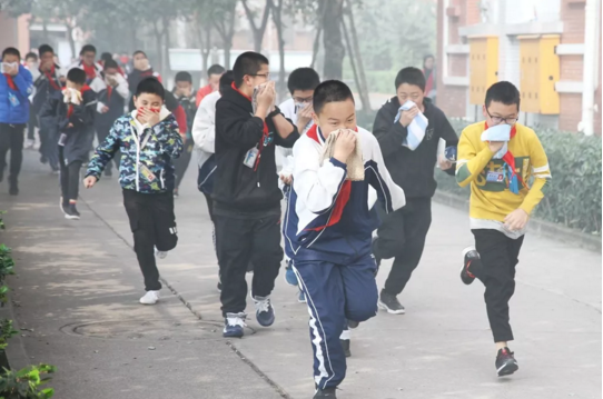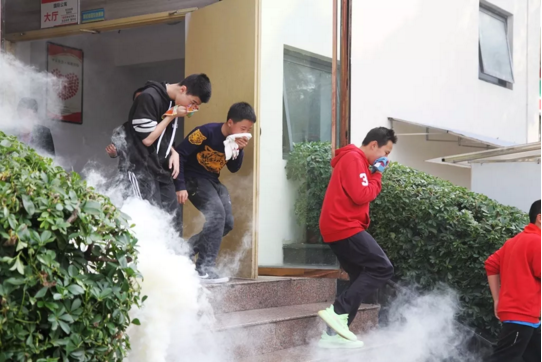 一路上的濃煙彌漫并未打亂大伙兒的陣腳,師生們紛紛掏出濕毛巾掩住口鼻,繼續向“安全區”進發。