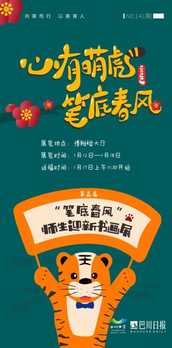 “筆底春風”師生迎新書畫展今年已舉辦第五屆,是巴川美術組的品牌活動之一,在辭舊迎新之際同學們將一年以來創作的優秀作品進行展示交流。今年入展作品是在全校近5000件課堂習作中遴選出來的優秀作品,有各年級的萌虎主題創作、美術社團作品、小班6個美術項目班的優秀作業、美術特長生作品,包含了素描、水粉、水彩、油畫、國畫、版畫、陶藝、書法、篆刻、剪紙等類別,總量近500件,是對巴川一年來美術課堂教學成果的集中展示。今年適逢農歷虎年,萌虎題材的作品占據了很大的比例,深受同學們歡迎。