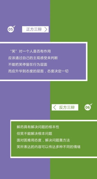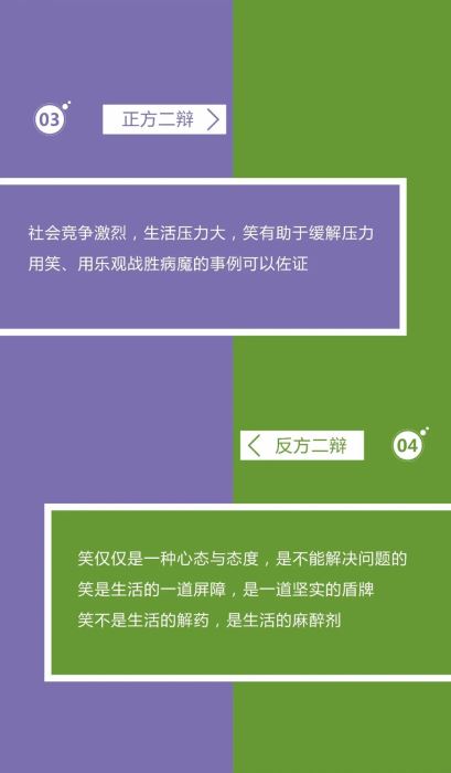 最后,拿到辯題要先分析,一是定義先行,輔以對辯題的理解。這一點來看,反方做得更好一些,一、二、三辯均對此內容有詳細的解釋,特別是反方二辯說笑有“大笑、微笑、苦笑、假笑、嘲笑”等等。第二還要明確一點就是“解藥”在此處是一個形象化的說法,是用的比喻,那么就要從解藥這一喻體出發,知道它的定義,并且由一辯給這個喻體解藥劃定一個范圍。這樣雙方才可以就這個區域內進行攻守上的辯論。