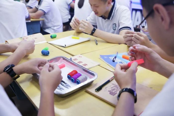 譚松雪老師設計了吸管“穿越土豆”的體驗活動,解讀《學霸秘籍》的內功心法三式;余洋老師將土豆想象成困難,通過承受、解決、利用完成解決困難三步曲,設計的 A4 紙切土豆,學生感受挑戰(zhàn)成功后的欣喜,也體會到了青春的無限可能;石釗源老師設計的后背傳畫,活動中體會合作的三要素(共同目標、理解溝通、團隊奉獻);胡元利老師在穿針引線間巧解同學們的人際交往問題。田嬌老師的“優(yōu)點轟炸”、鄒瑞濃老師的食指抬人、唐喜老師的整理收納賽,都通過精心設計的體驗活動,讓學生在參與中提高了認知,領會了真意。