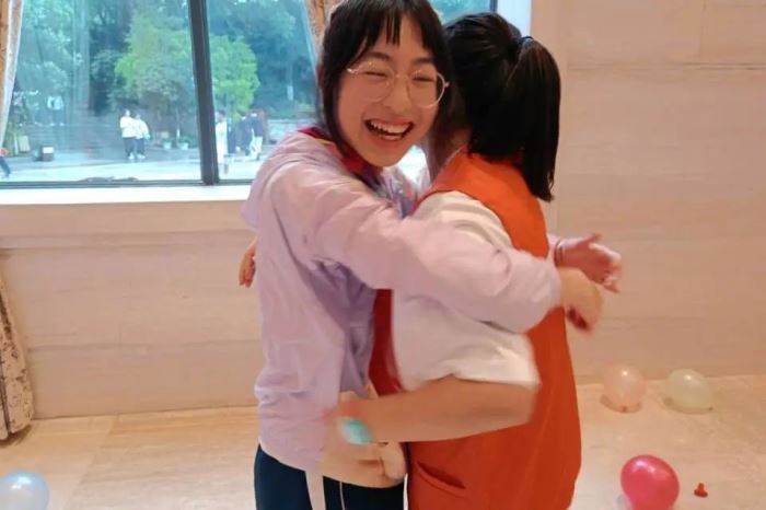 與好朋友緊緊擁抱,壓爆氣球,驅散煩惱