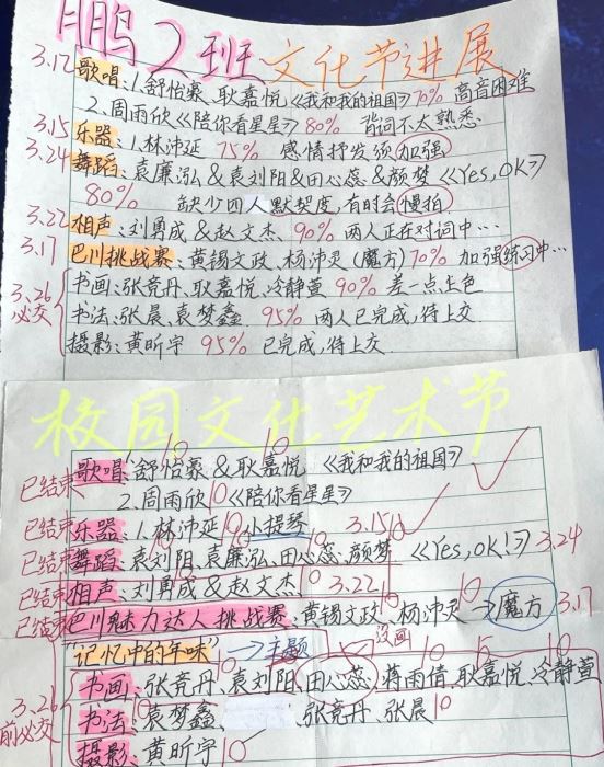 良性競爭的氛圍與優秀上進的孩子們相輔相成,報名積極踴躍。確定下人員后,兩個文藝委員會分工跟進節目內容的準備,以及后續每周的排練的進度計劃和推進!及時總結、跟進指導。每個周末,都會有百分比的節目的進度反饋單呈現在講桌上……