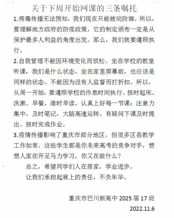 高一17班關欣欣老師給班上居家學習同學的三條囑托,告訴同學們正確看待疫情給生活帶來的影響,特別強調了自主管理的重要性,希望大家都要記著心中的夢想,更要扛起肩上的責任。