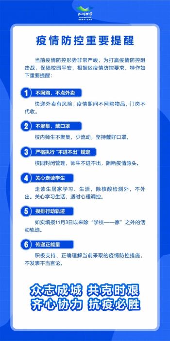 各年級迅速組織教師召開騰訊會,傳達會議精神,明確工作要求,落實工作安排。11月5日下午起,學校嚴格落實校門“不進不出”,安排專人監督學校的封閉管理情況。要求師生員工在校內要佩戴口罩,減少接觸,保持足夠的安全距離。通過班會、微信群、短信平臺等積極倡導師生不點外賣、不購買快遞物品。