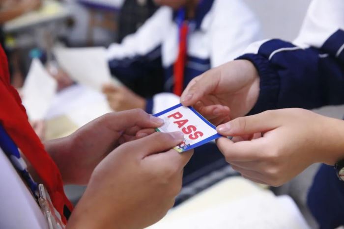 同學們隨機抽取口試試題,準備好后依次到考官處測試。對存在發音問題的同學,小考官會當面指出并予以糾正;對測試合格的同學,會現場頒發音標PASS卡。