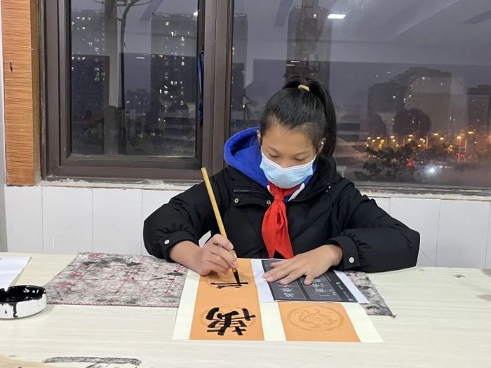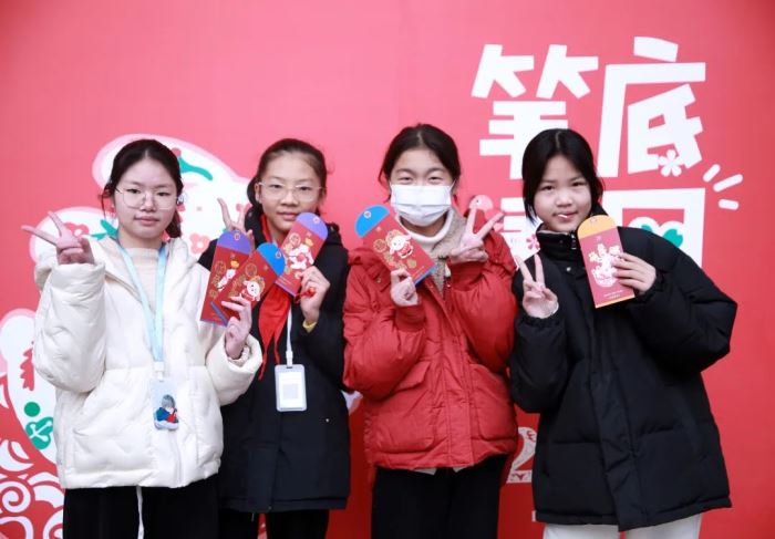 展覽前一周,在美術(shù)學科組的組織下,喜歡書法的老師和同學們積極參與進來,利用課余時間書寫了300余副春聯(lián)和福字,以及學生設計的600多份定制福貼和2000多個紅包贈送給老師和同學們。還有一支送福小分隊,送到身在門崗值班的保安,送到服務教學的部門和年級,將一份份暖心祝福送給辛勤工作中的巴川人。