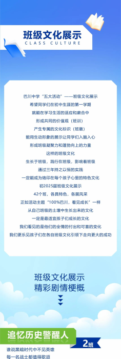 班級文化是文明的種子,讓每個(gè)巴川學(xué)子的靈魂,都散出文明的芬芳;班級文化是少年的詩歌,涌動(dòng)激情,點(diǎn)燃夢想。心有所動(dòng)何須遠(yuǎn)行,校園也有詩和遠(yuǎn)方。
