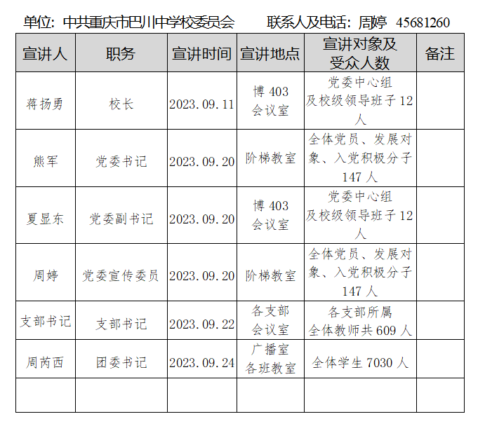 會議要求,我們要把學習貫徹全會精神宣講工作作為近階段學校的重要政治任務,提高思想認識,增強學習的內在自覺、行動自覺,強化理論武裝、提升政治素養,通過中心組學習、黨員集中學習、主題黨日、教職工政治學習和全校師生廣播講話等方式層層推進,學出好效果,將全會精神轉化為推動學校高質量發展的強大動力。