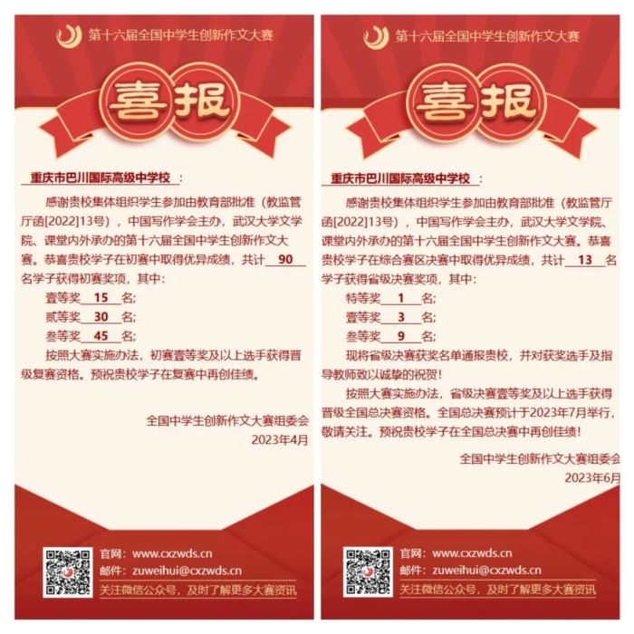 同時,巴川積極鼓勵和引導學生參與各種全國性的賽事,在去年舉行的世界華人學生作文大賽中,高2025屆已有十余位同學獲得獎項。