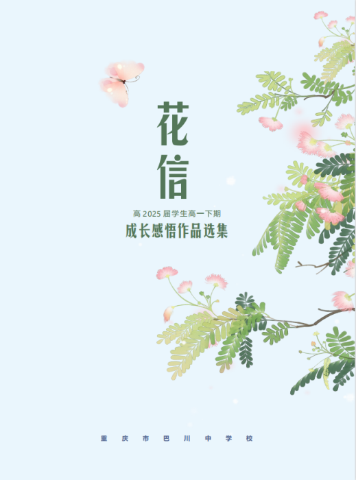 現階段,高中的應試作文偏向議論文和實用性,但巴川的老師們一直鼓勵同學們從真實的生活出發,更細致地體驗、觀察、發現和感悟生活,抒發自己真實的情感。前不久,高2025屆舉行了“成長有痕”專題寫作,同學們回顧了自己的成長經歷,以作文的形式與父母對話,表達了自己真實的內心。年級語文組還特地篩選整理了本次專題寫作的優秀作品,印刷并分發了《花信——高2025屆學生成長感悟作品選集》,供全年級學生觀摩學習。巴川老師們對作文的情感和美學價值的堅持,是符合創新作文大賽的一貫宗旨的,也是巴川學子能夠在本次復賽中取得優異成績的原因之一。