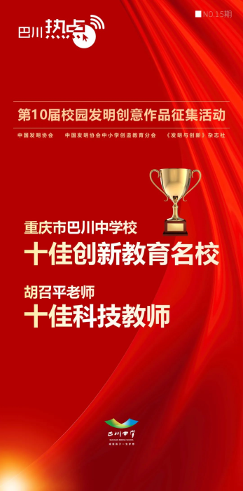 為表彰和鼓勵優秀團體單位和優秀輔導老師,組委會根據活動規程,秉承公平公正的原則,評選出本屆活動團體獎和名師獎。按照各團體所有成員作品獲金獎計5分、銀獎計3分、銅獎計1分,統計各參賽組織學校團體總分,按總分從高至低依次排名。重慶市巴川中學校榮獲“十佳創新教育名校”榮譽稱號。按照各輔導老師所輔導學生作品獲金獎計5分、銀獎計3分、銅獎計1分(一件作品同時有兩名或以上輔導老師的,按人數相應比例計算)統計積分,授予重慶市巴川中學校胡召平老師“十佳科技教師”榮譽稱號。