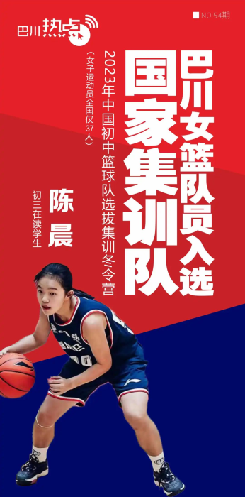 巴川中學初三在讀學生陳晨憑借在2022-2023中國初中籃球聯賽(西區)比賽中的優異表現,成功入選此次集訓營37人女子運動員名單。