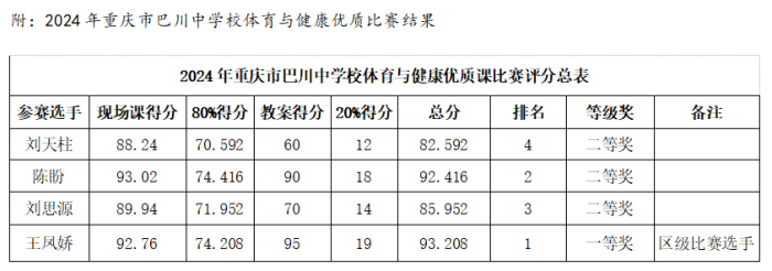 本次活動邀請了銅梁區進修校蘇醒老師、重慶市巴川中學體藝處吳波主任、教科處劉松主任、教務處沈小麗主任、以及體藝處沈潔主任助理和付希國主任助理和孫麗霞老師擔任評委。評委們始終以實事求是的工作態度,嚴謹科學的工作作風對待本次評選活動;通過認真聽課、精心記錄、現場打分、集中評課、交流等環節,評出一等獎1名、二等獎3名,以達到以賽促評,以賽促研的目的。