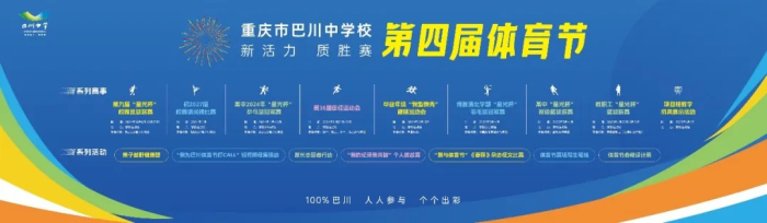 “強健體魄”,巴川學子四大核心能力之首。體育節,核心能力的集中展現。讓每一個孩子能參與、有成長,是本屆體育節的初心。于是,我們推出了包含足球、籃球、乒乓球、羽毛球、課間操、田徑運動會等9項賽事,以及會徽設計展、個人挑戰賽、親子越野跑等與運動會相關的周邊活動7項,極大地豐富了運動會的內涵與外延。